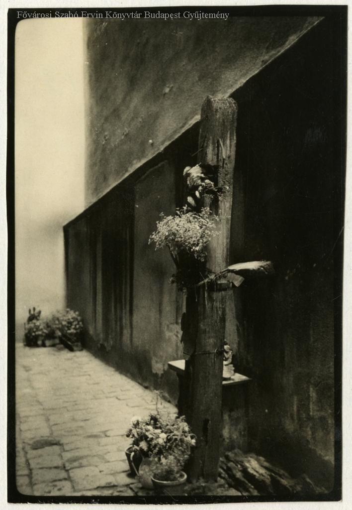[Virágokkal díszített faoszlop az Akadémia utca 13. számú ház hátsó udvarában]