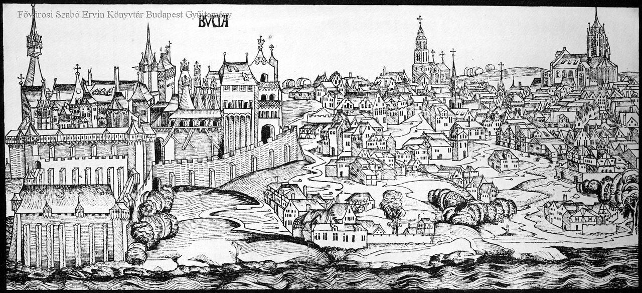 Buda látképe 1470 körül keleti nézet, Schedel metszete után