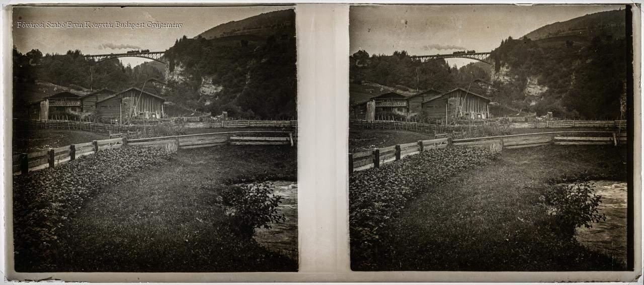 konyhakert, növényzet, fa, hegyvidék, lakóépület, házi kert, épület, tájkép, viadukt, vasúti közlekedés, vonat, 1900-as évek