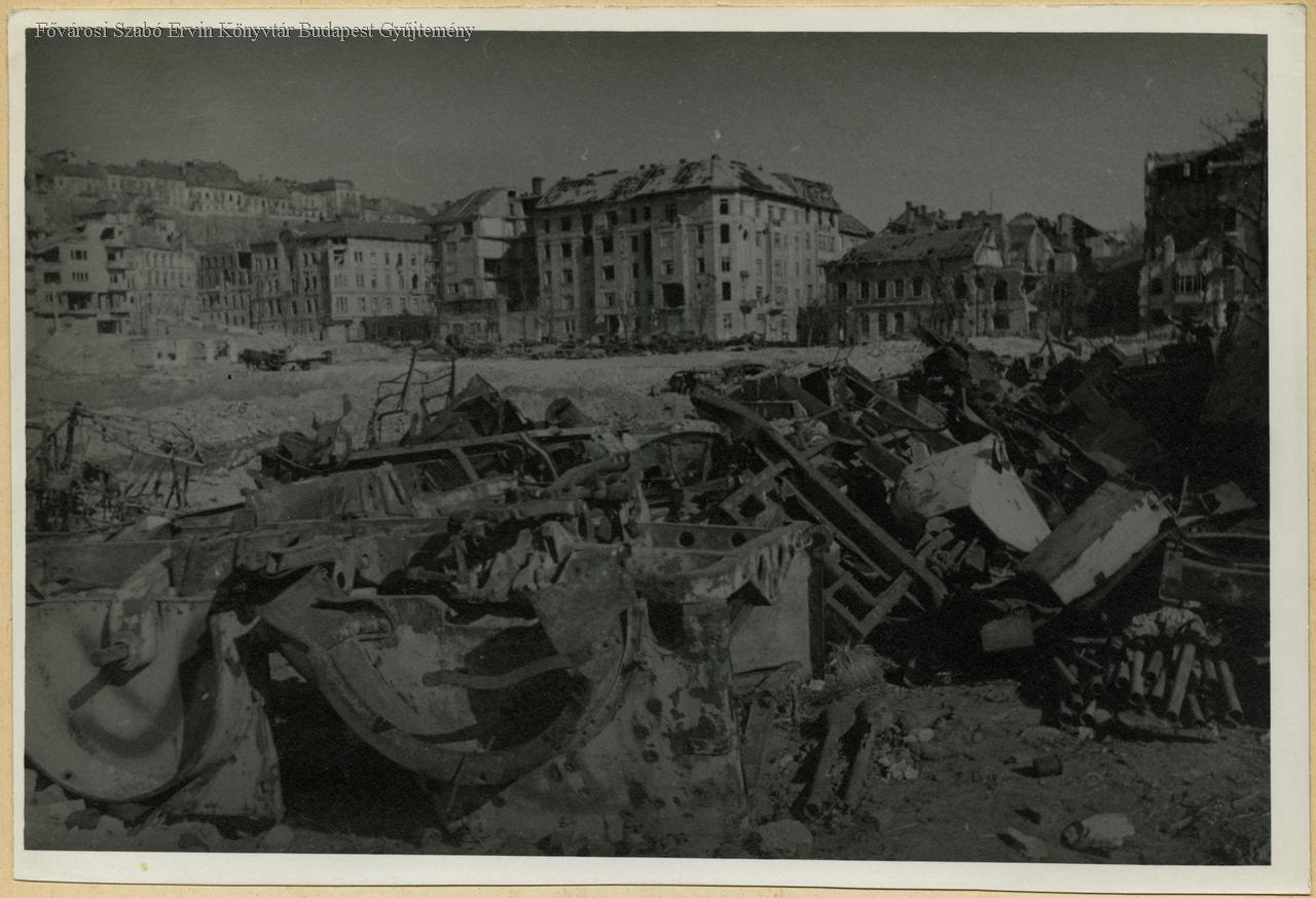 Az előtérben a Vérmezőre hordott gépkocsi és harckocsi roncsok