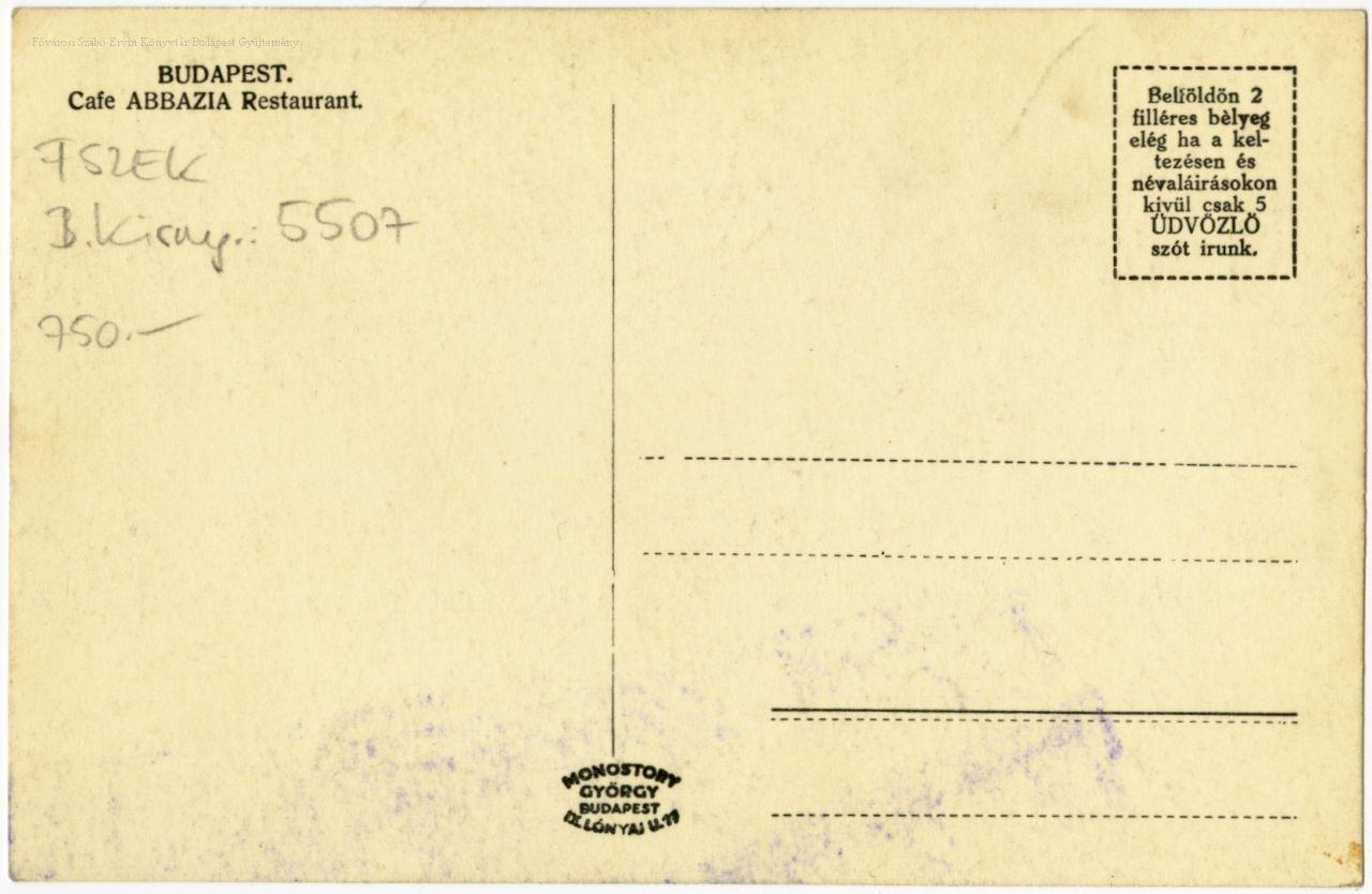 Kiadási adat a képeslapon: Monostory György, Budapest IX. Lónyai u. 17.