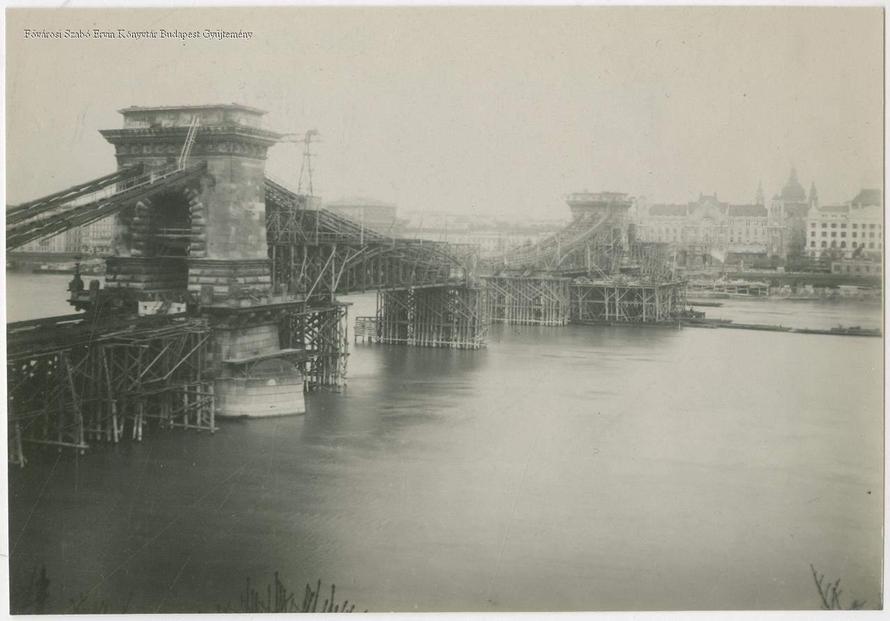 A Lánchíd átépítése, vasszerkezetének megerősítése. Teljes rekonstrukció: 1914. február 3-tól 1915. november 26-ig. Látlép a budai oldal felől, háttérben a Gresham-palota épülete, és a Szent István-bazilika kupolája láthatók.