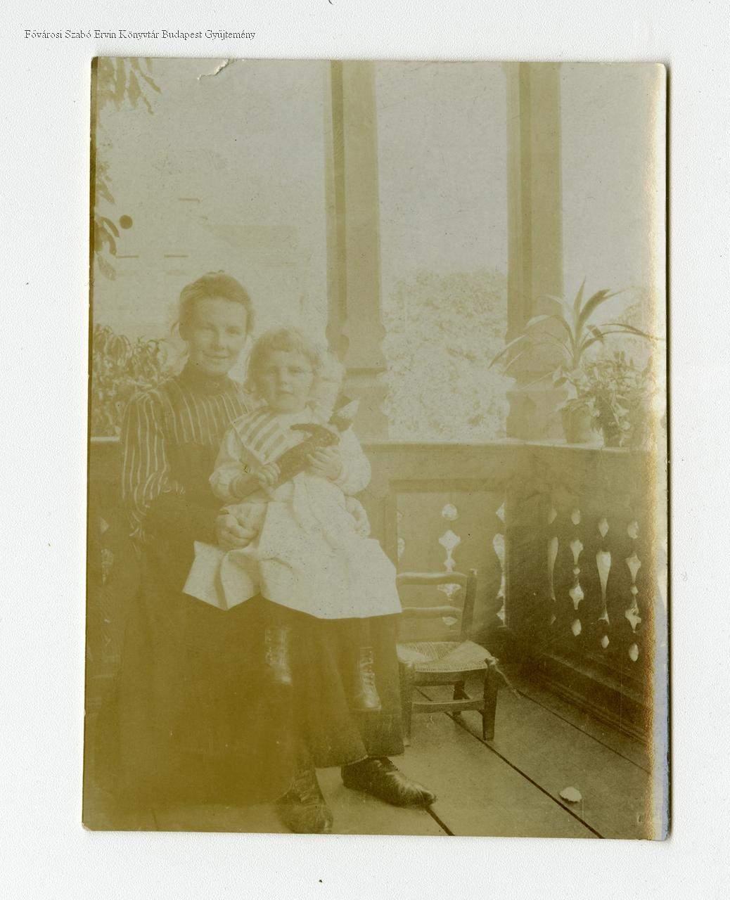 [Egy nő, kislánnyal ölében a tornácon ül]