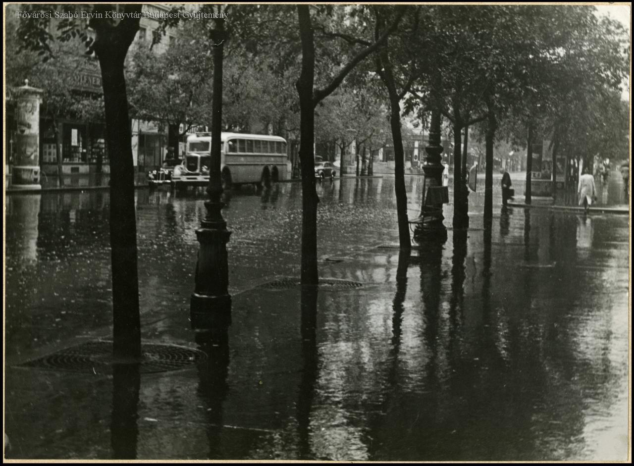 utcakép, eső, autóbusz, fa, utcabútor, 1942