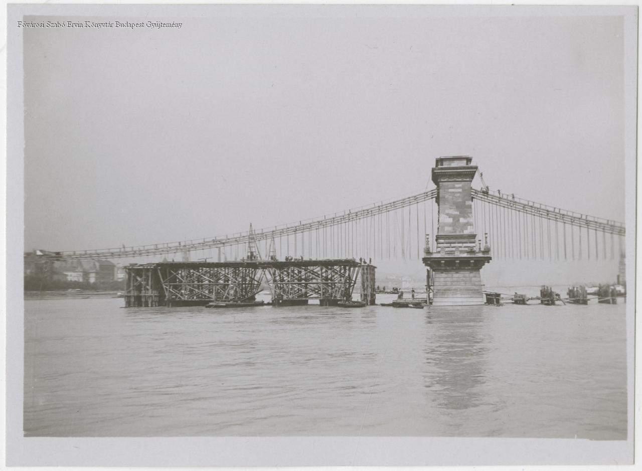 A Lánchíd átépítése, vasszerkezetének megerősítése. Teljes rekonstrukció: 1914. február 3-tól 1915. november 26-ig. Látkép a Duna felől.