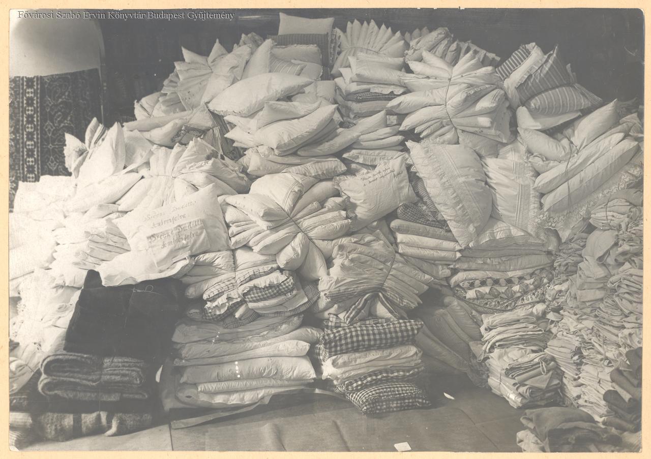 jótékonyság, adakozás, ágynemű, hátország, háborús sebesült, sajtófotó, első világháború, 1914-1918