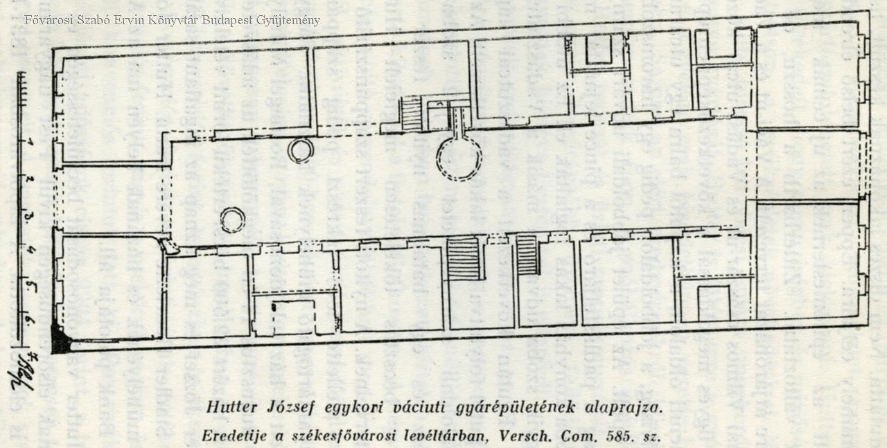 Hutter József egykori váciuti gyárépületének alaprajza Eredetije a székesfővárosi Levéltárban. versch. Com. 585 sz.