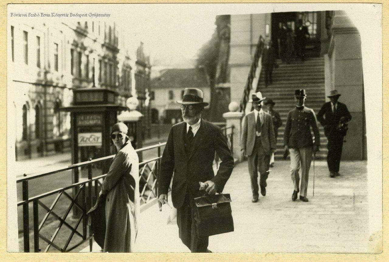 külső felvétel, utcakép, lépcső, miniszterelnök, nő, férfi, katona, siklóvasút, sétapálca, napszemüveg, divat, fényképezőgép, Horthy-korszak