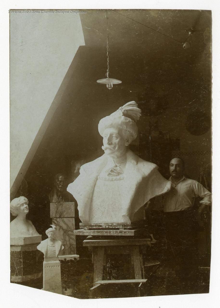[Zsákodi Csiszér János szobrászművész Százados úti műtermében gróf Pálffy Jánosról készült mellszobrával, 1913 körül]