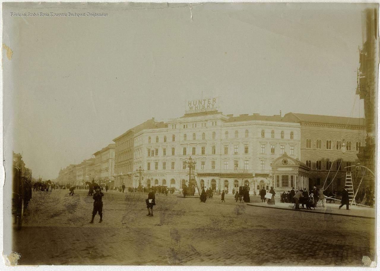 lakóépület, ember, ló, lovas kocsi, földalatti vasút, állomás, reklámtábla, lámpa, közvilágítás, gyalogos közlekedés, külső felvétel, utcakép, 1900-as évek
