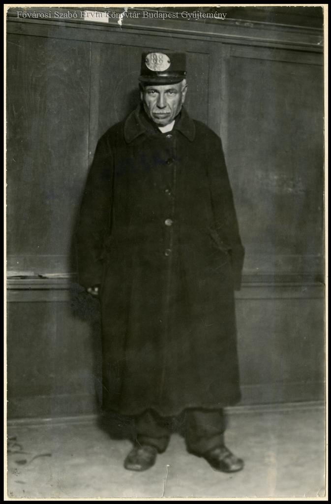 Idős hordárok viselte számjeles, ellenzős sapkában, télikabátban