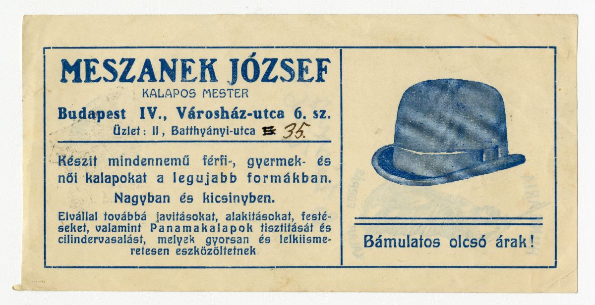 Meszanek József (...) Készít mindennemű férfi-, gyermek - és női kalapot a legújabb formákban.