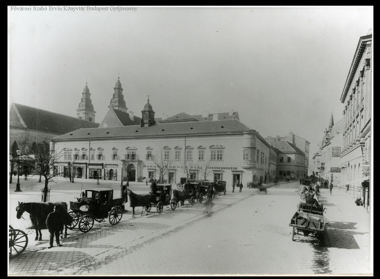 A piarista rendházban üzletek. Előtérben bérkocsisor, a Kötő utca házai hosszant látszanak