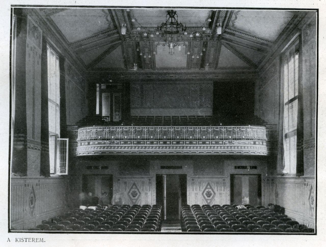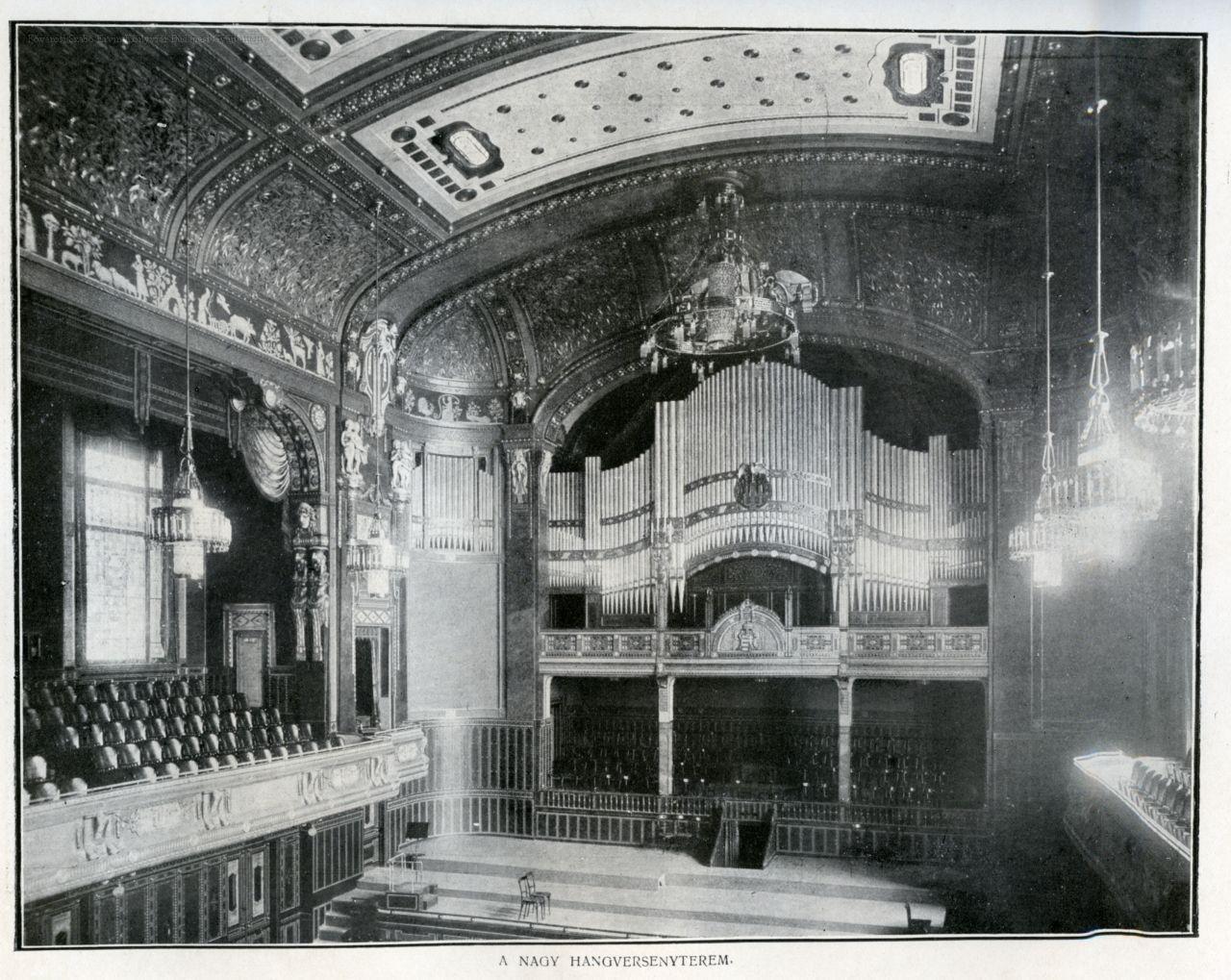 főiskola, egyetem, felsőfokú zeneoktatási intézmény, lámpa, díszkút, üvegművészet, előcsarnok, hangversenyterem, belső felvétel, 1907