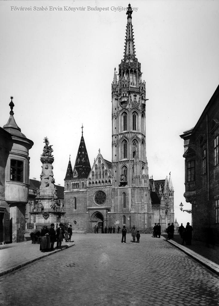 A Mátyás templom a Schulek-féle átépítés utolsó szakaszában. Jobbra a régi budai városháza, balra a lakóház mögött a régi Pénzügyminisztérium (később részben lebontották). Járókelők