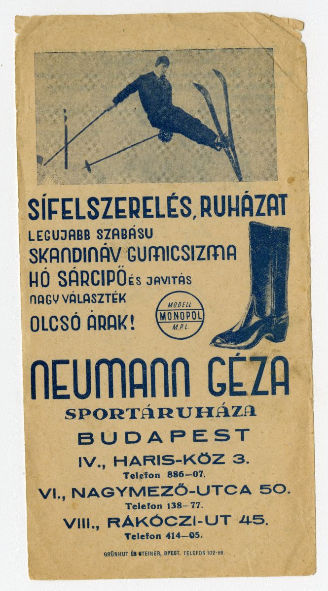 gumicsizma, cipő, sárcipő, hócipő, cipész, cipőjavítás, sport, sportfelszerelés, sportruházat, síelés, sísport, síléc, síruha, férfi, áruház, üzlet, reklámnyomtatvány, kisnyomtatvány, aprónyomtatvány, számolócédula