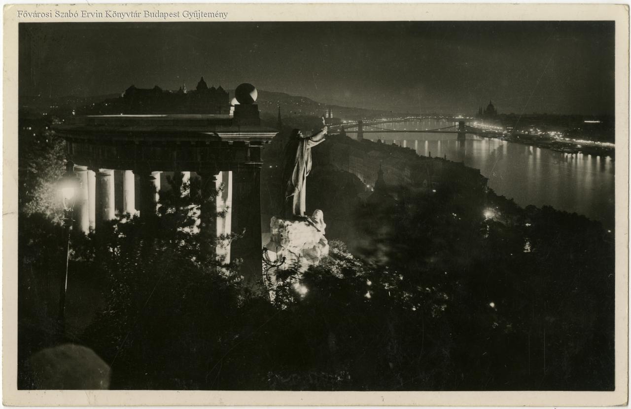 Előtérben a kivilágított szobor, látkép északi irányban Buda és Pest látképével