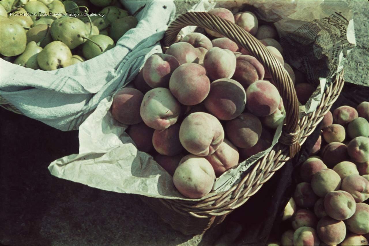 csendélet, piac, gyümölcs, őszibarack, körte, áru, kosár, 1937-1944