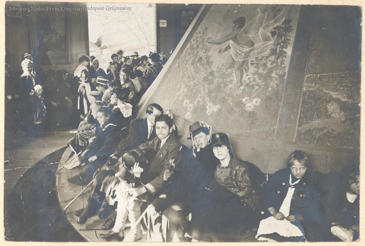 Festményekkel díszített harangkörhintán ülő fiatalok