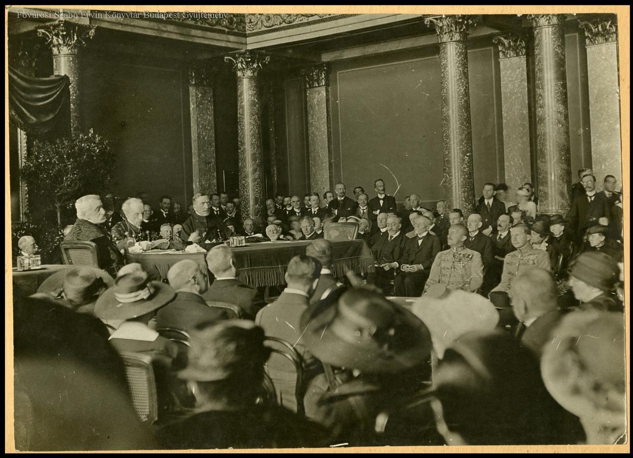 Az alsó asztalnál József Ferenc főherceg ül. Az elnmöki asztalnál Berzeviczy Albert akadémiai elnök olvas fel