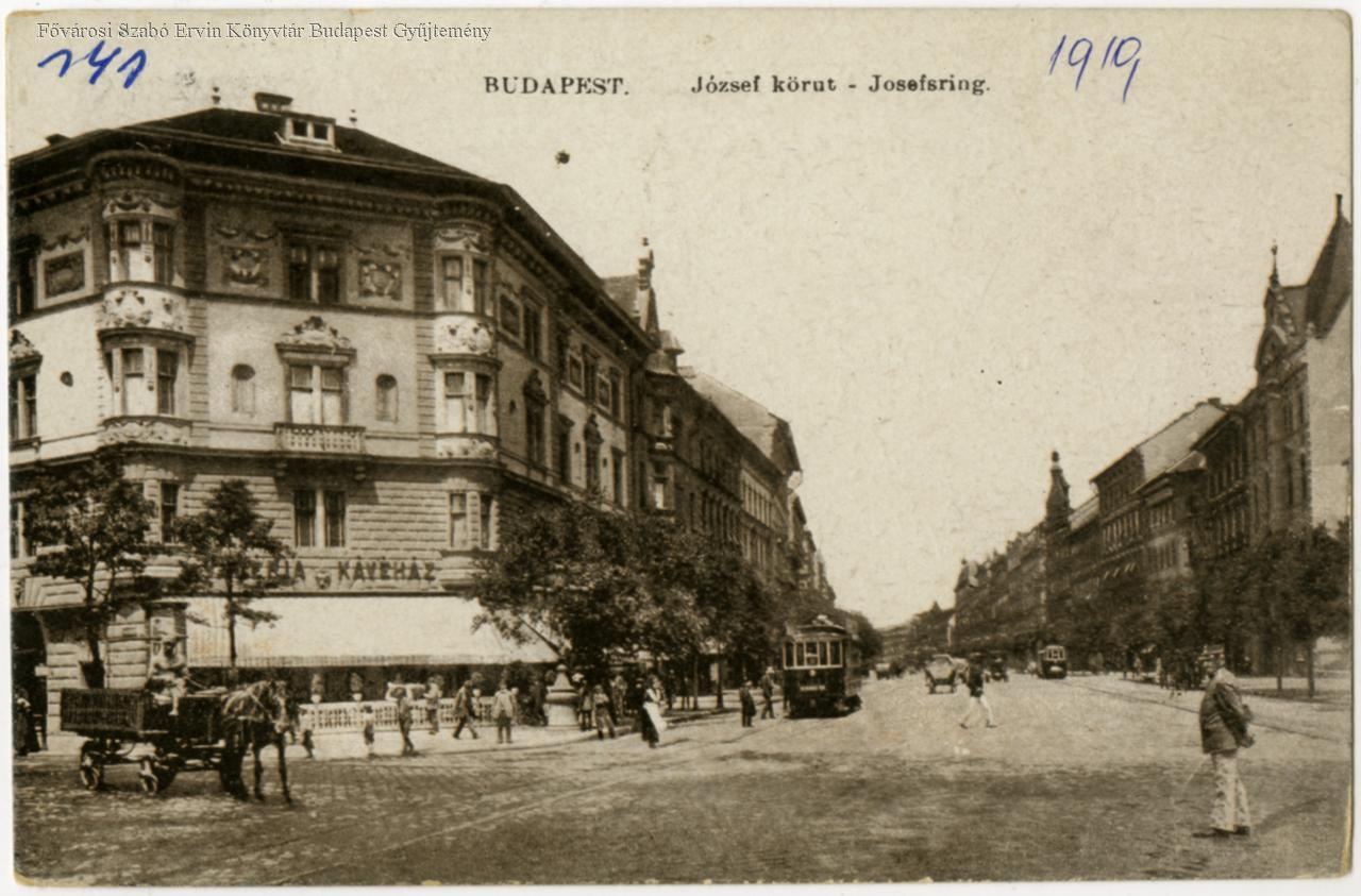 bérház, képes levelezőlap, kávéház, villamos kocsi, lovas kocsi, utcakép, 1915 körül, századelő