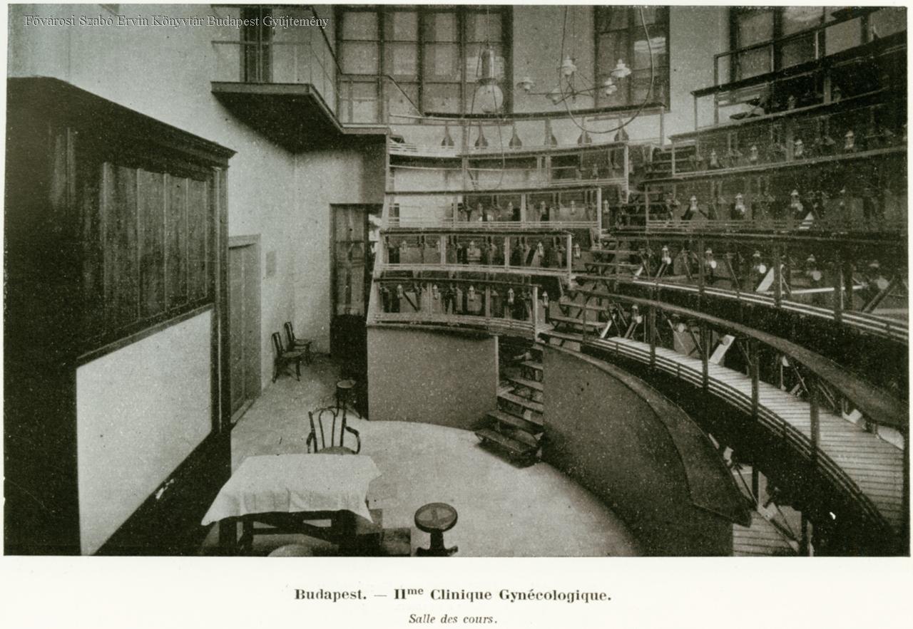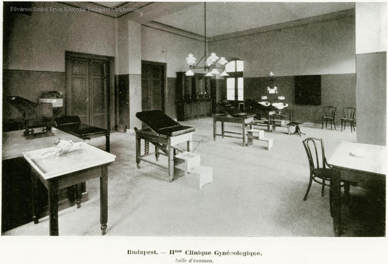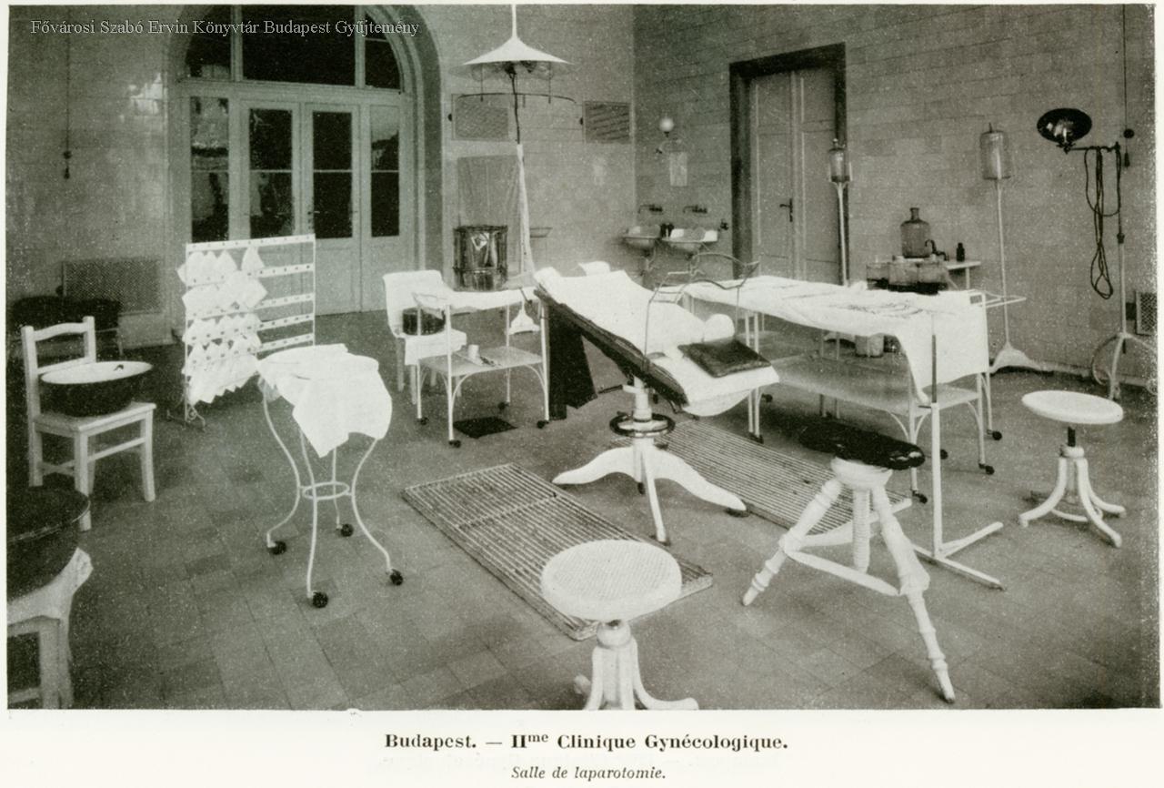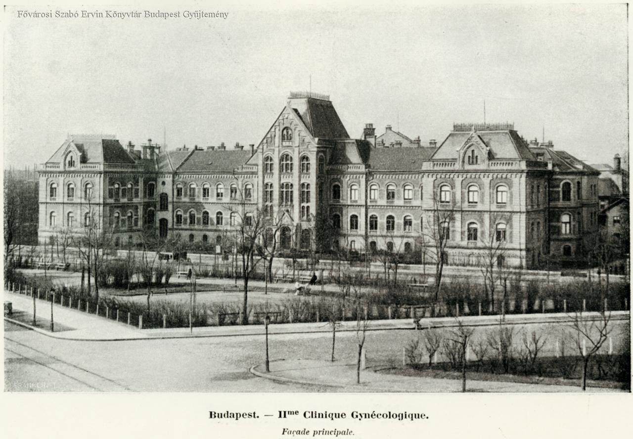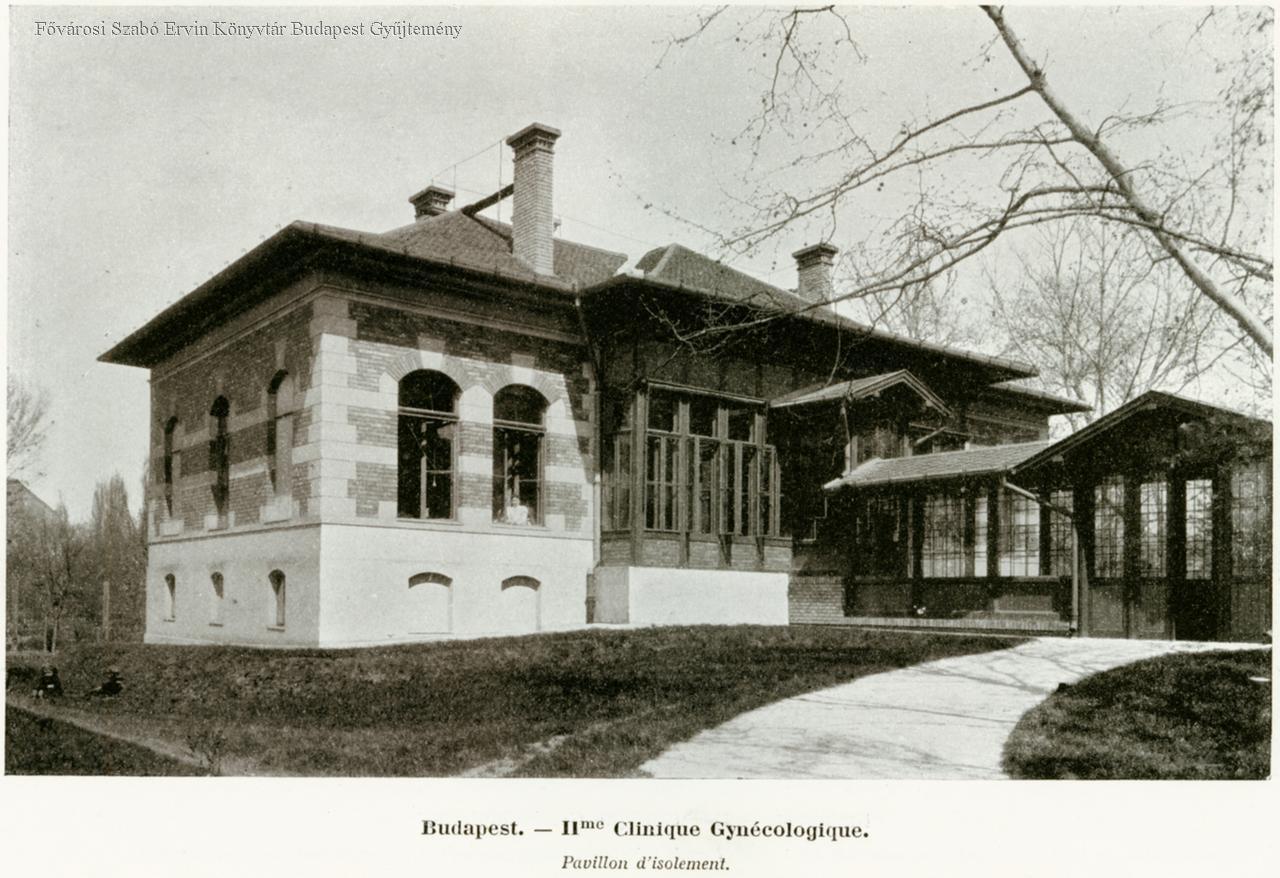 Budapest II-me Clinique Gynécologique Façade principale, pavilon d'isolement, salle des cours, salle d'examen, salle de laparotomie, salle du travail, salle des accouchées,