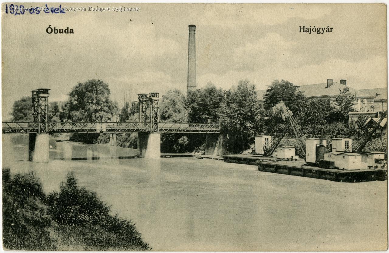 képes levelezőlap, folyó, hajó, hajógyár, hajógyártás, kémény, híd, ipari épület, 1910-as évek