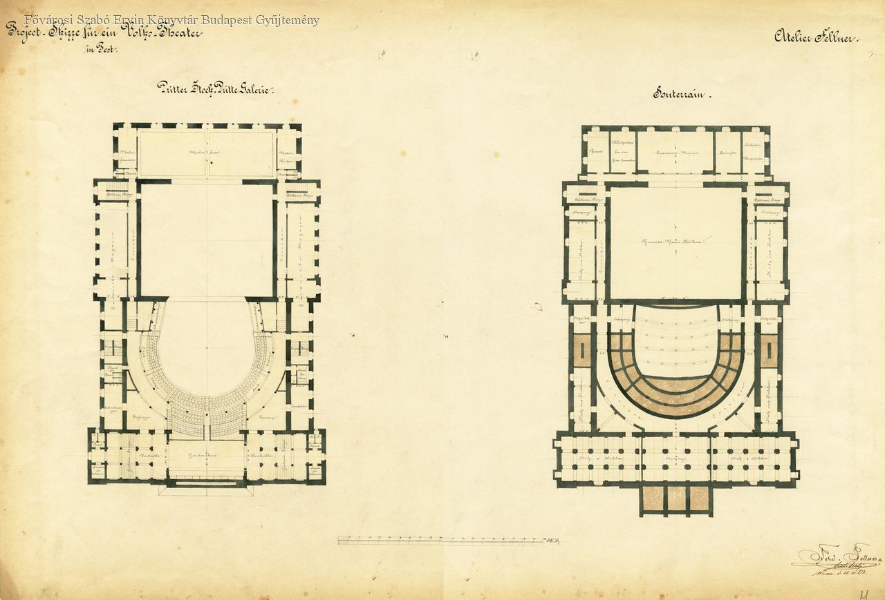 Projekt Skizze vür ein Volkstheater in Pesth, Atelier Fellner, Dritter Stock, Souterrain [Népszínház alaprajzai, harmadik emelet, alagsor]