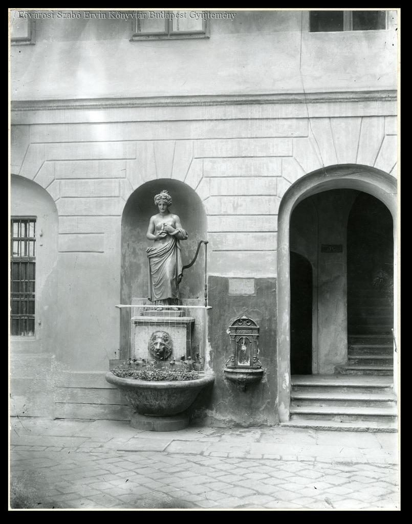bérház, udvar, falfülke, díszkút, szobor, nő, lépcső, épületkép, külső felvétel, 1900-as évek