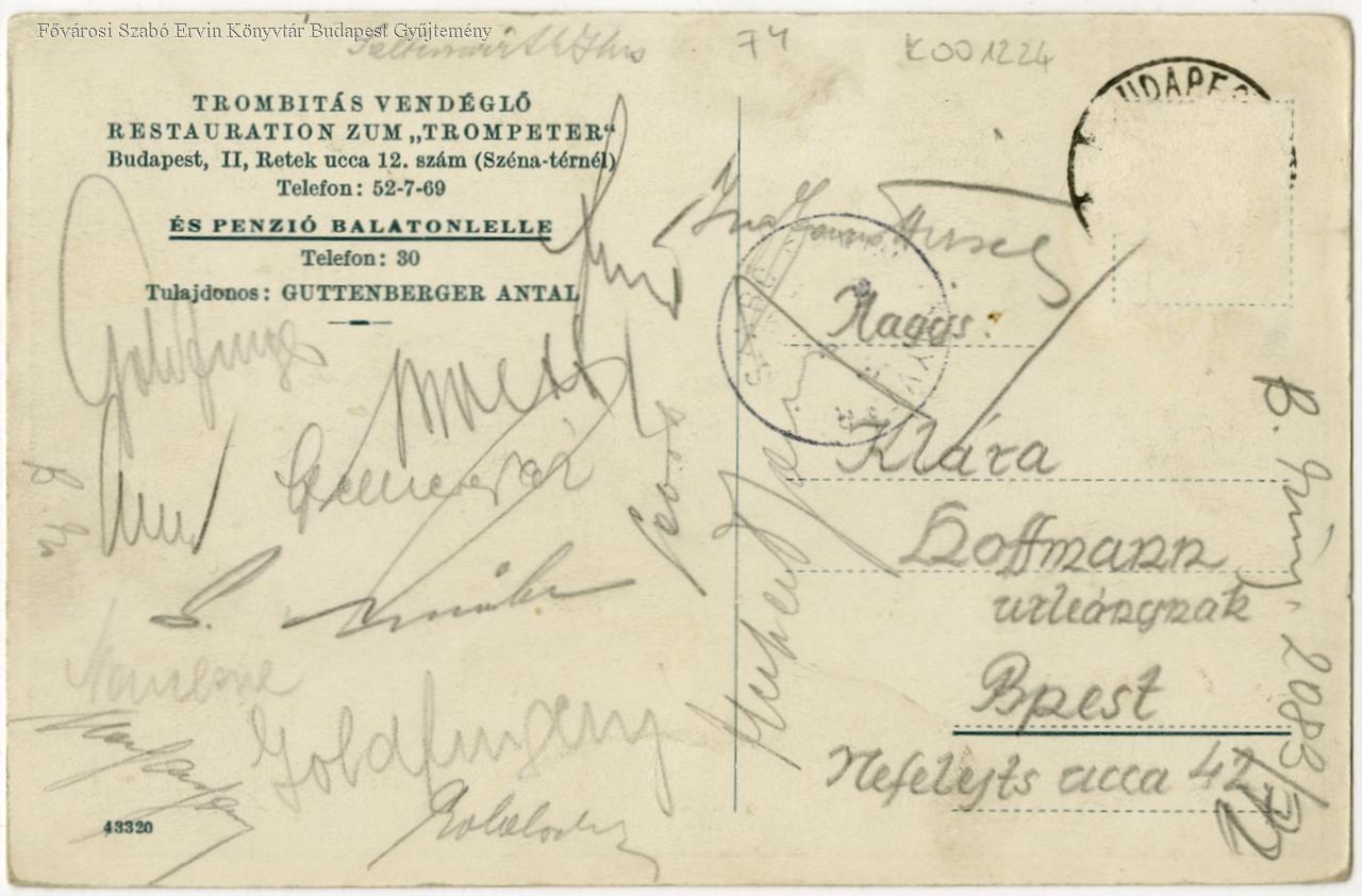 Trombitás vendéglő Restauration zum "Trompeter" : Budapest. II, Retek uca 12. szám (Széna térnél) : telefon 52-7-69 : és penzió Balatonlelle : telefon: 30 : tulajdonos Guttenberger Antal