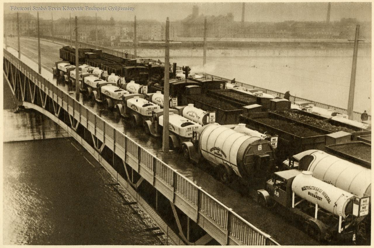 A hídon megrakott vasúti kocsik, korabeli utcai öntözőautók és szemétgyűjtő autók (kukás autók)