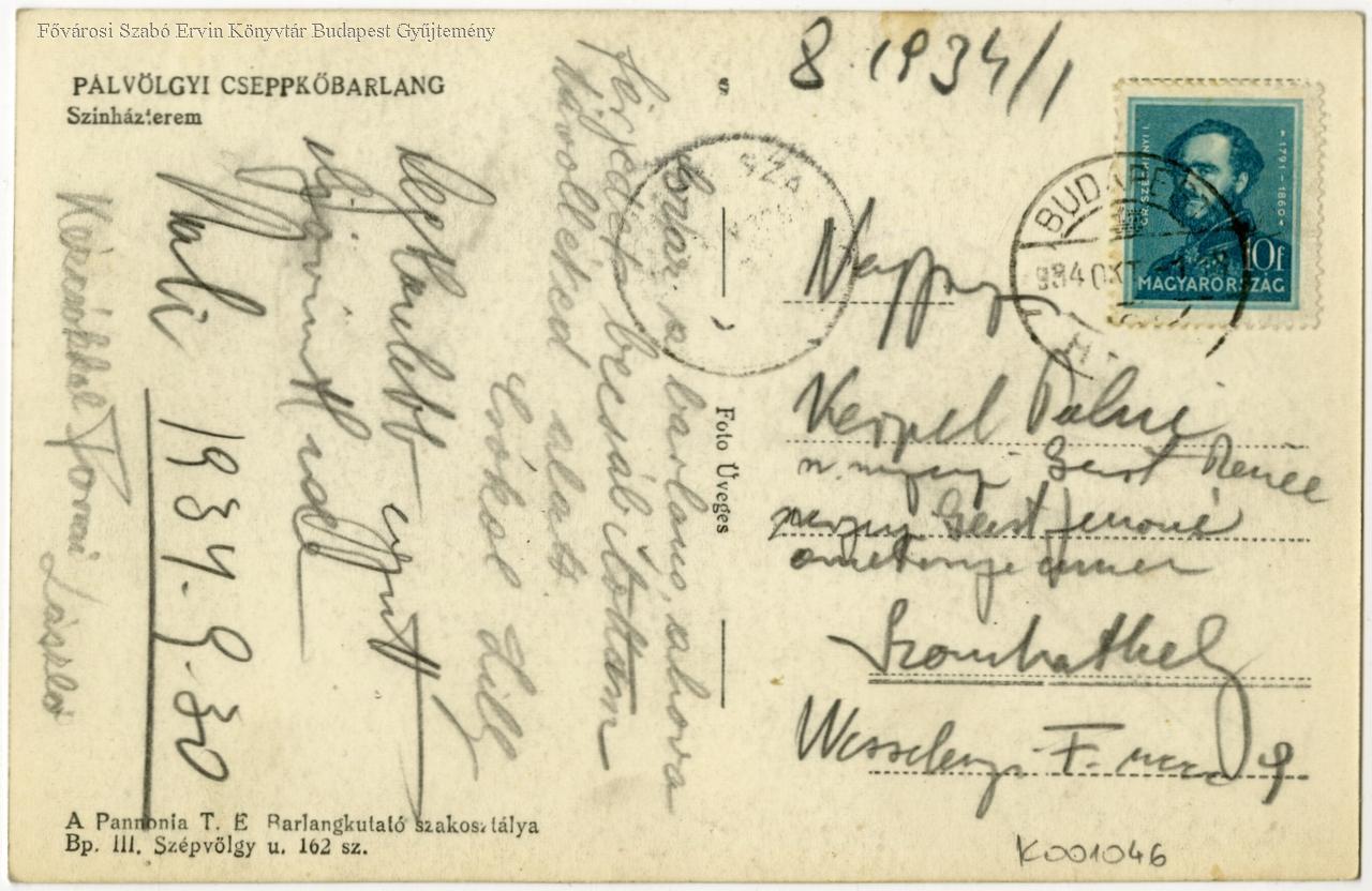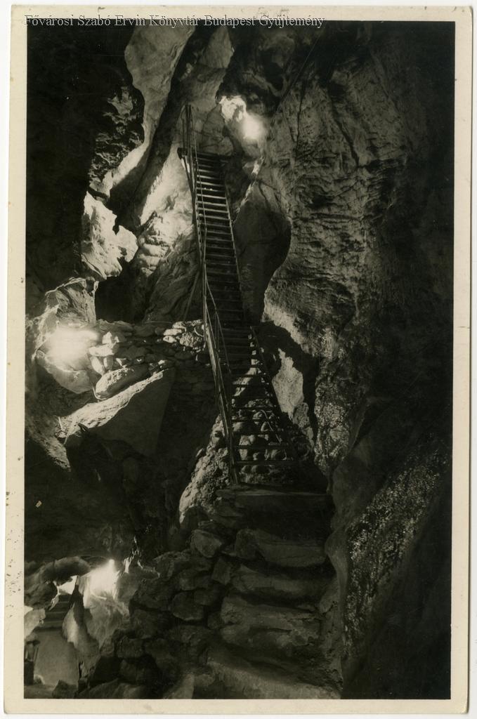 képes levelezőlap, belső felvétel, cseppkőbarlang, barlangászat, turizmus, lépcső, 1930-as évek