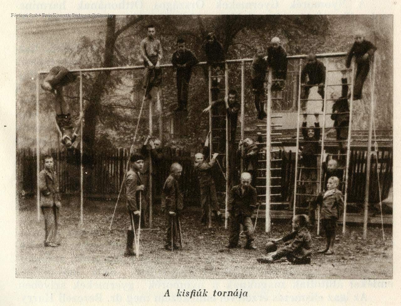 külső felvétel, jelenetkép, nevelőotthon, mozgássérült, fiú, gyermek, tanuló, testnevelés, testgyakorlat, tornaszer, szociális gondoskodás, 1920-as évek, 1930-as évek