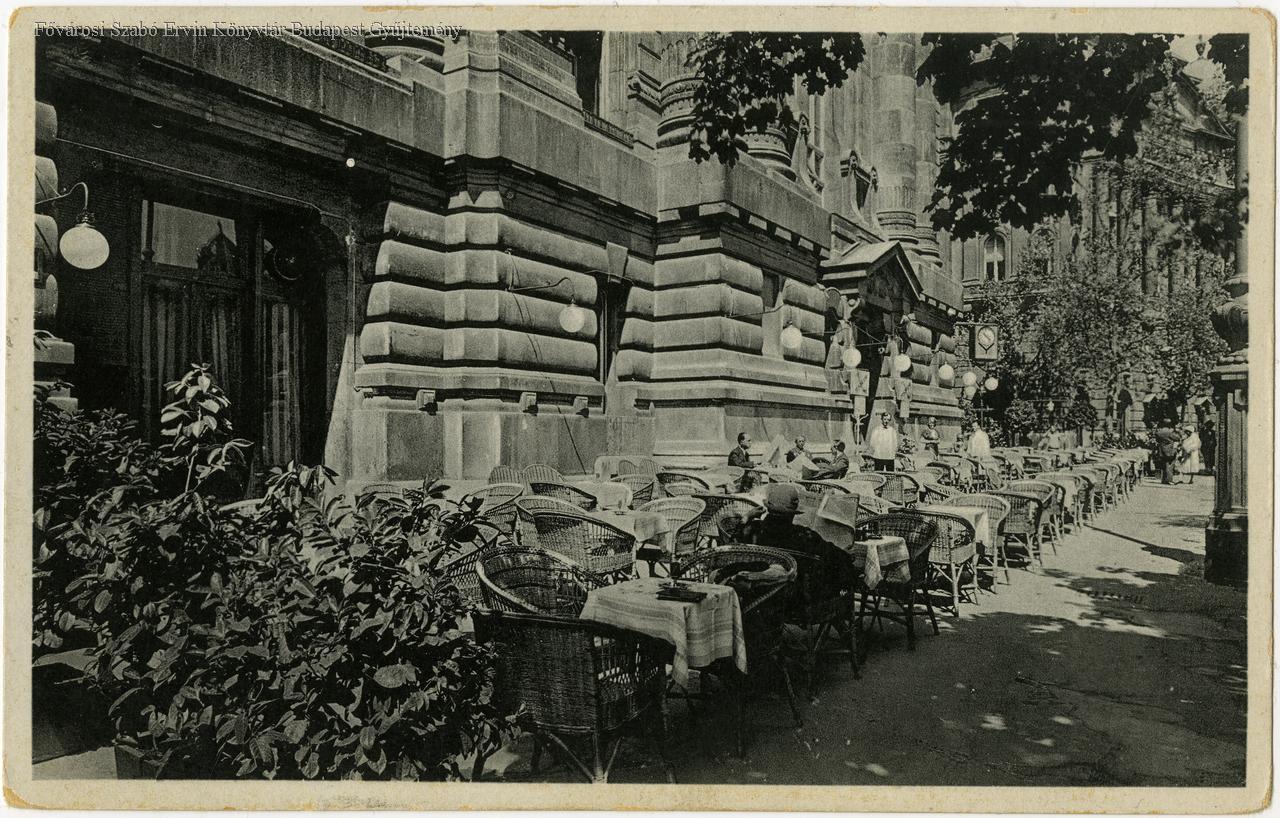 kávéház, épületkép, asztal, fonott szék, dísznövény, képes levelezőlap, 1930-as évek