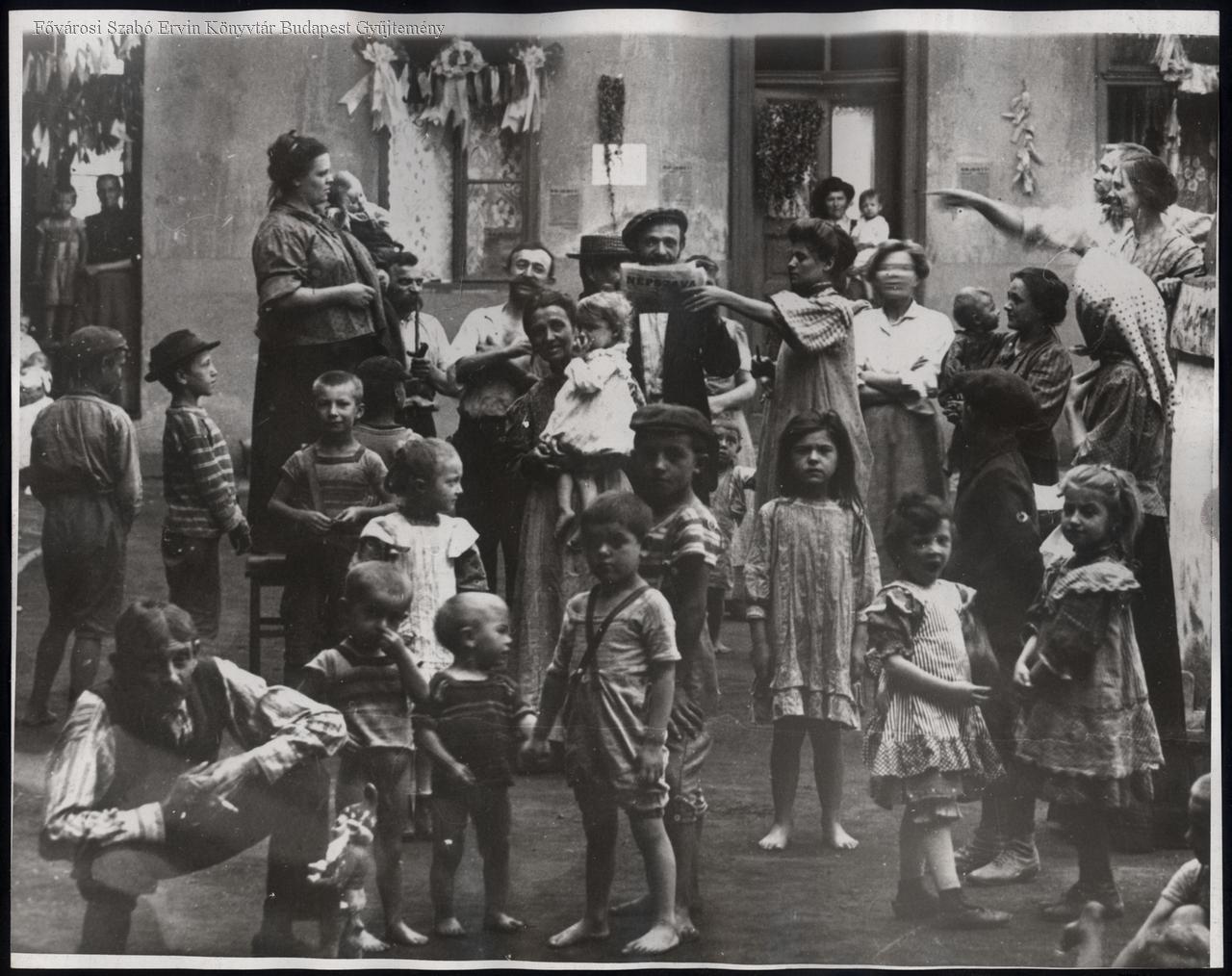 Nők, férfiak és gyermekek tömege egy szegényes udvarban. Népszavát tartó férfi