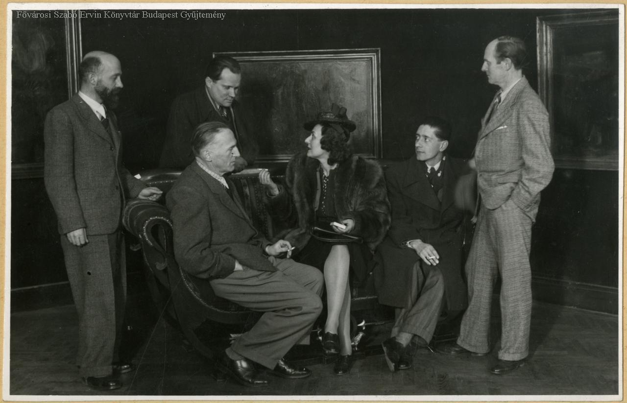 Az új magyar művészet öt képviselőjének kiállítása Almásy-Teleki Éva művészeti intézetében Almásy-Teleki Éva, tőle jobbra Domanovszky Endre ül, mellette Gadányi Jenő áll. Balra Ferenczy Béni ül, mögötte Dési Huber István, őmellette Barcsay Jenő : 1941. március 30.