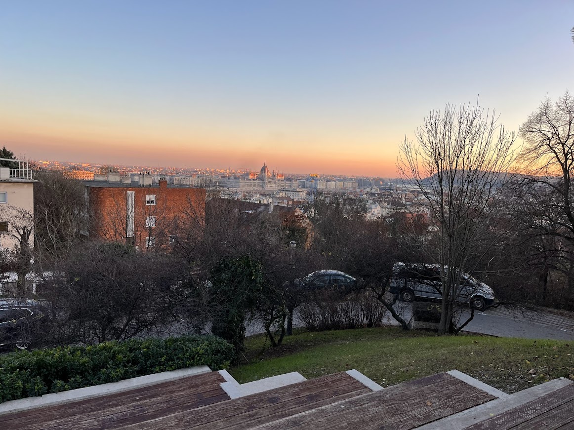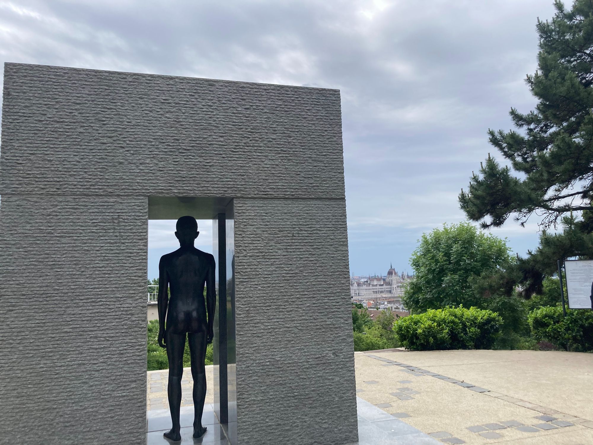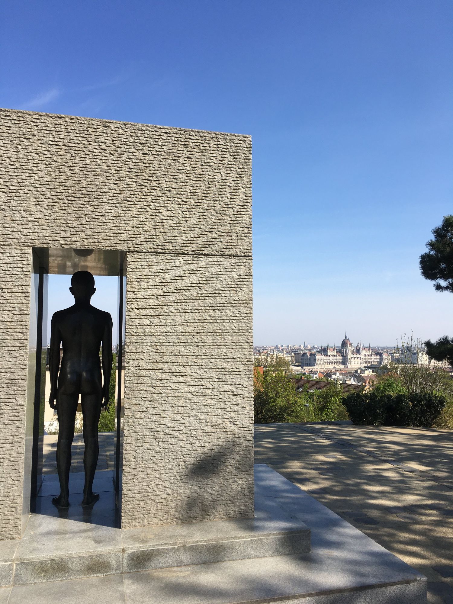 Egy meztelen fiatal fiú kőtömbök közé zárt bronzszobra fürkészi a pesti panorámát a Rózsadomb egyik remek kilátópontjáról.