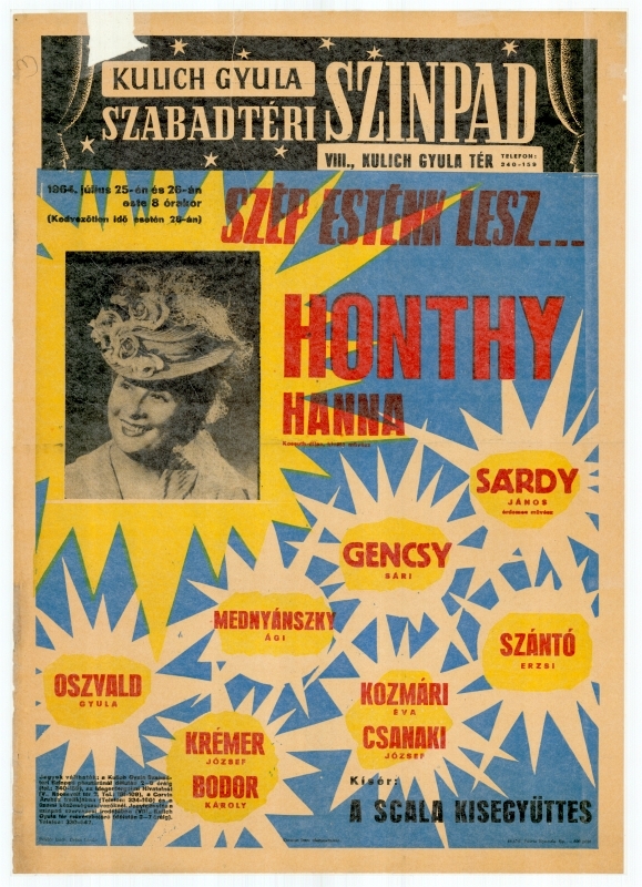 Színházi plakát az 1964. július 25-26-i előadásról "Szép esténk lesz..." címmel, amelyet az Ulich Gyula Szabadtéri Színpadon tartottak. A főszereplő Honthy Hanna (1893-1978), mellette szerepel: Oszvald Gyula, Mednyánszky Ági, Gencsy Sári, Sárdy János, Kremer József, Bodor Károly, Kozmári Éva, Csanaki József, Szántó Erzsi. A plakáton Honthy Hanna fényképe is látható. Az előadást a Scala kisegyüttes kísérte.