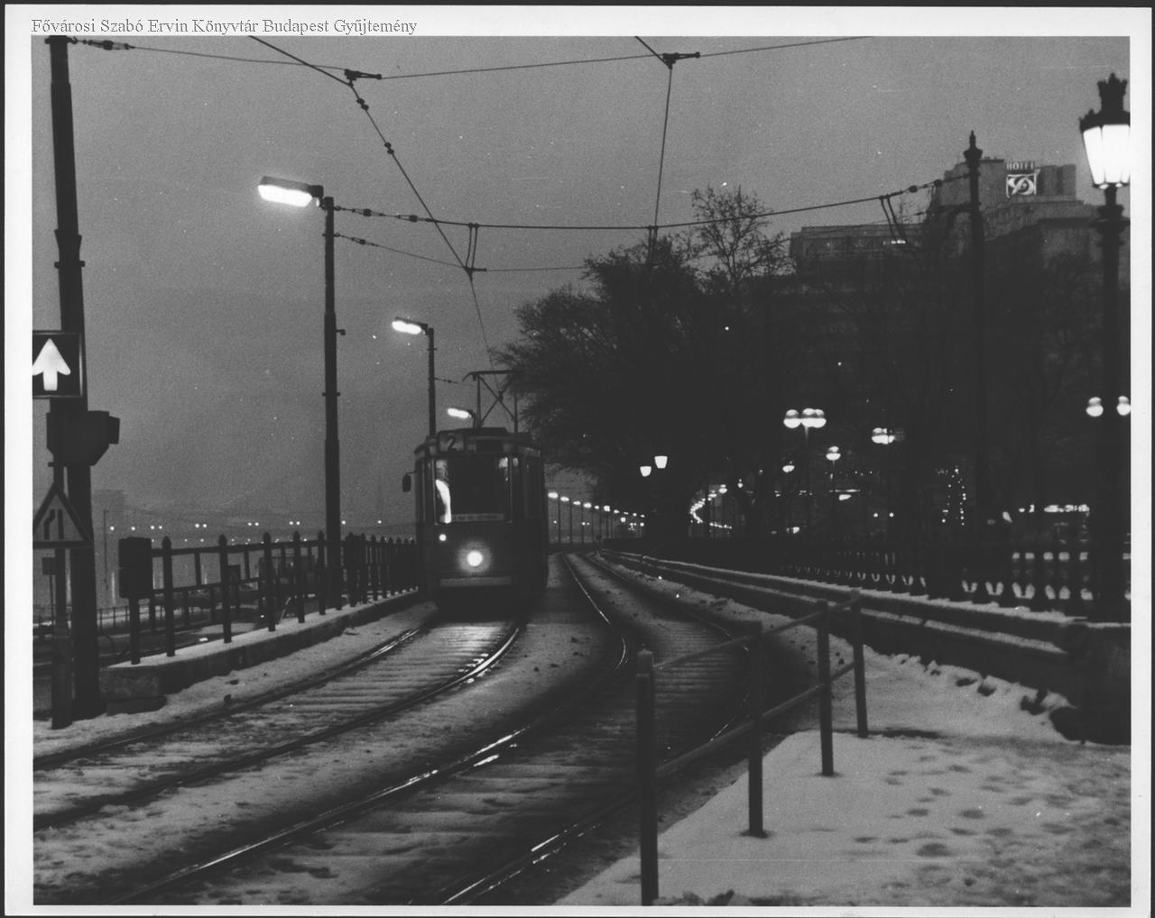szálloda, villamos kocsi, jármű, tél, utcakép, esti felvétel, 1984