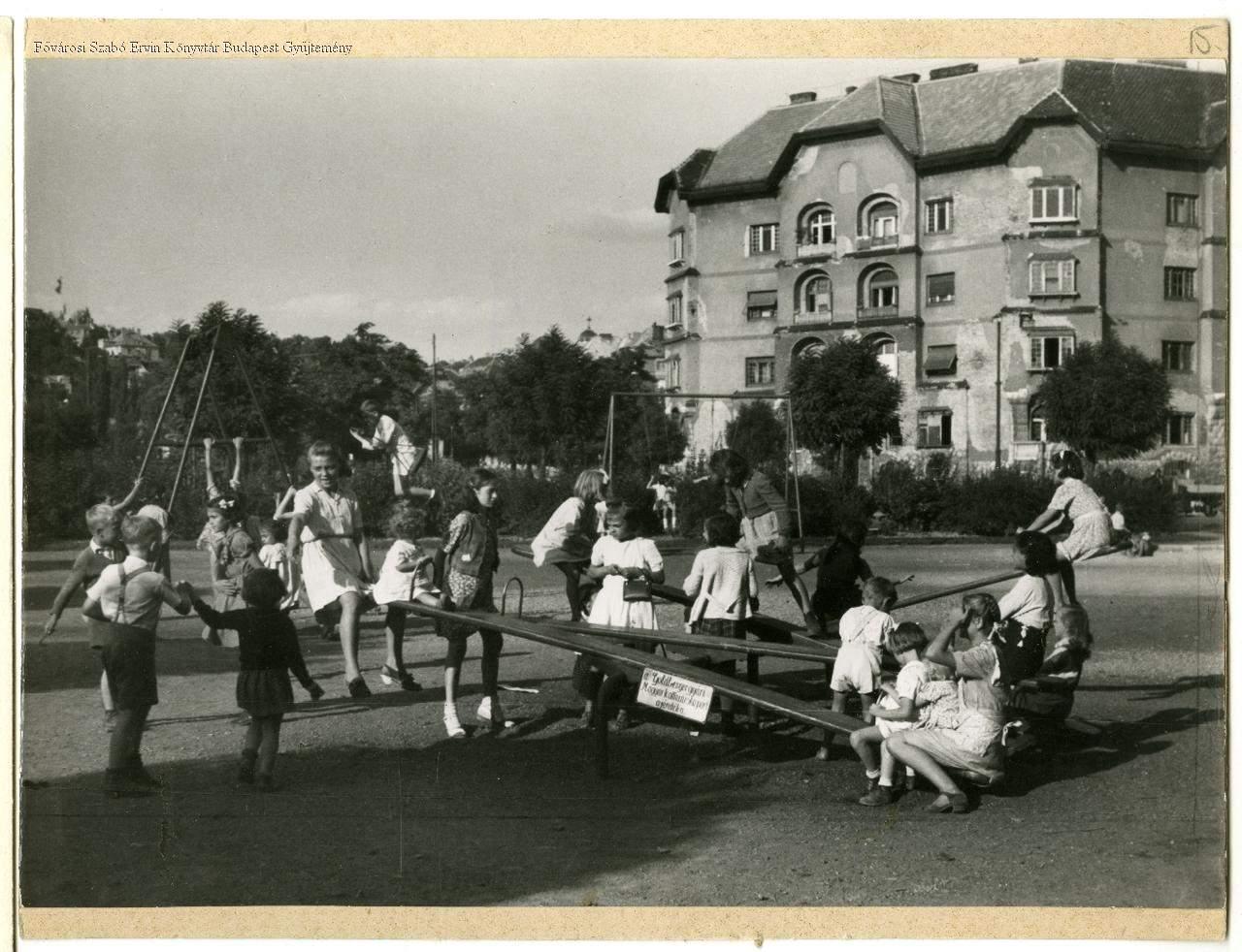 játszótér, hinta, gyermek, lakóépület, külső felvétel, életkép, 1940-es évek