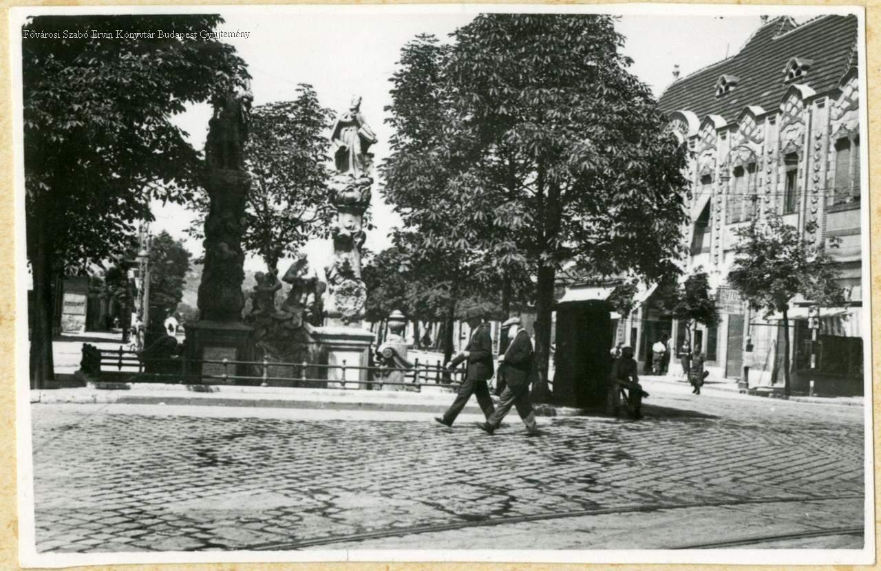 szobor, fogadalmi emlék, fa, ember, külső felvétel, utcakép, 1920-as évek