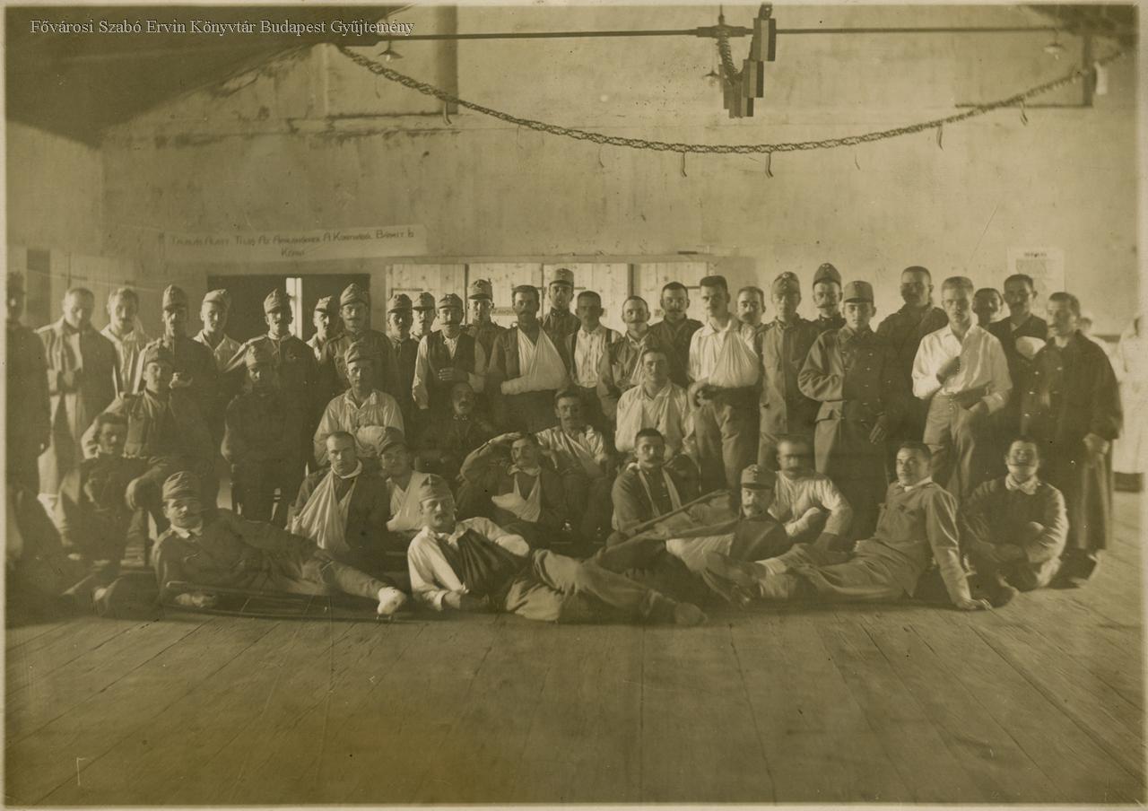 1. világháború, katona, egyenruha, háborús sebesült, katonai kórház, ideiglenes épület, belső felvétel, csoportkép, 1914