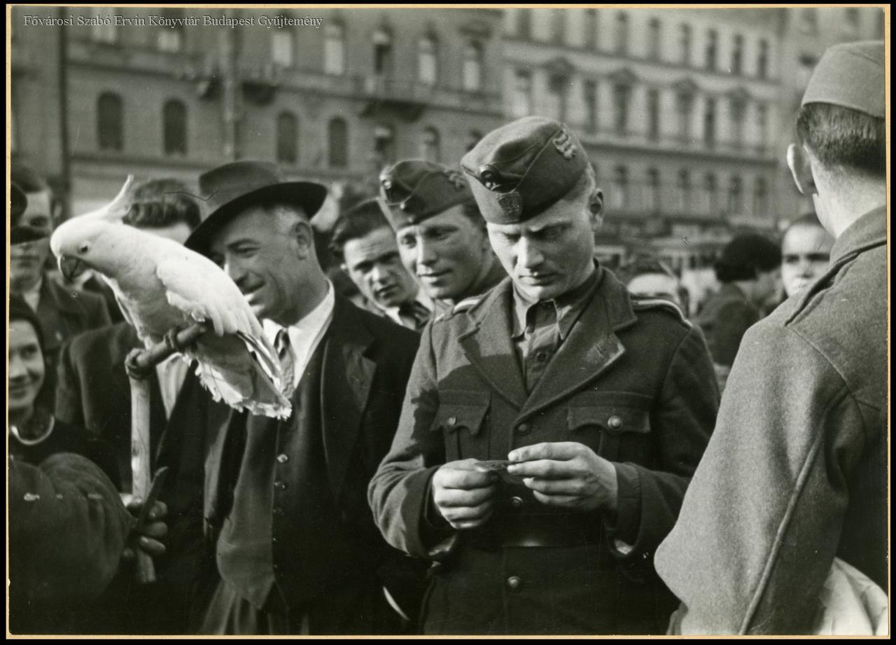 életkép, jelenetkép, látványosság, mutatványos, katona, nézők, férfi, papagáj, 1930-as évek