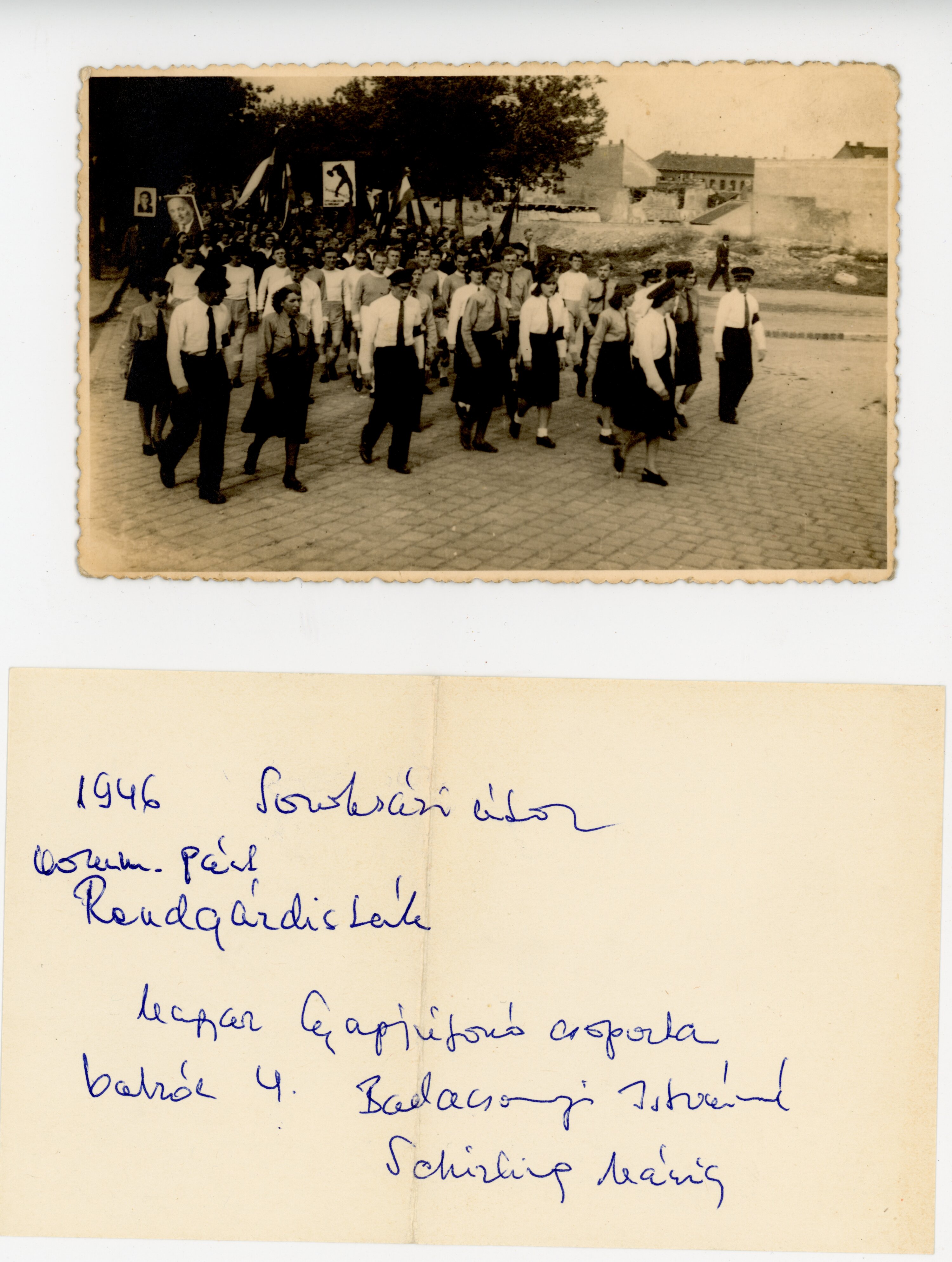 Soroksári úton 1946-ban a Magyar Kommunista Párt Rendgárdistái vonul. Magyar Gyapjúfonó csoport.,