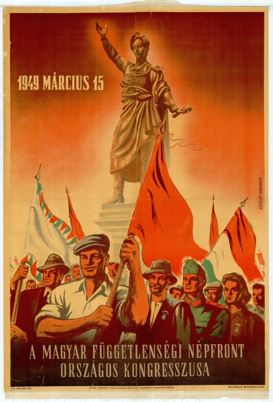 A Magyar Függetlenségi Népfront pártszövetség 1949. márciusi országos kongresszusát hirdető plakát, amely a Pilvax kávéház előtt álló Petőfi szobor egy stilizált verzióját, valamint egy nemzeti zászlókkal vonuló tömeget ábrázol. Ennek a kongresszusnak a céja a a kommunista vezetésű politikai egység megszilárdítása és az 1949-es választások előkészítése volt.