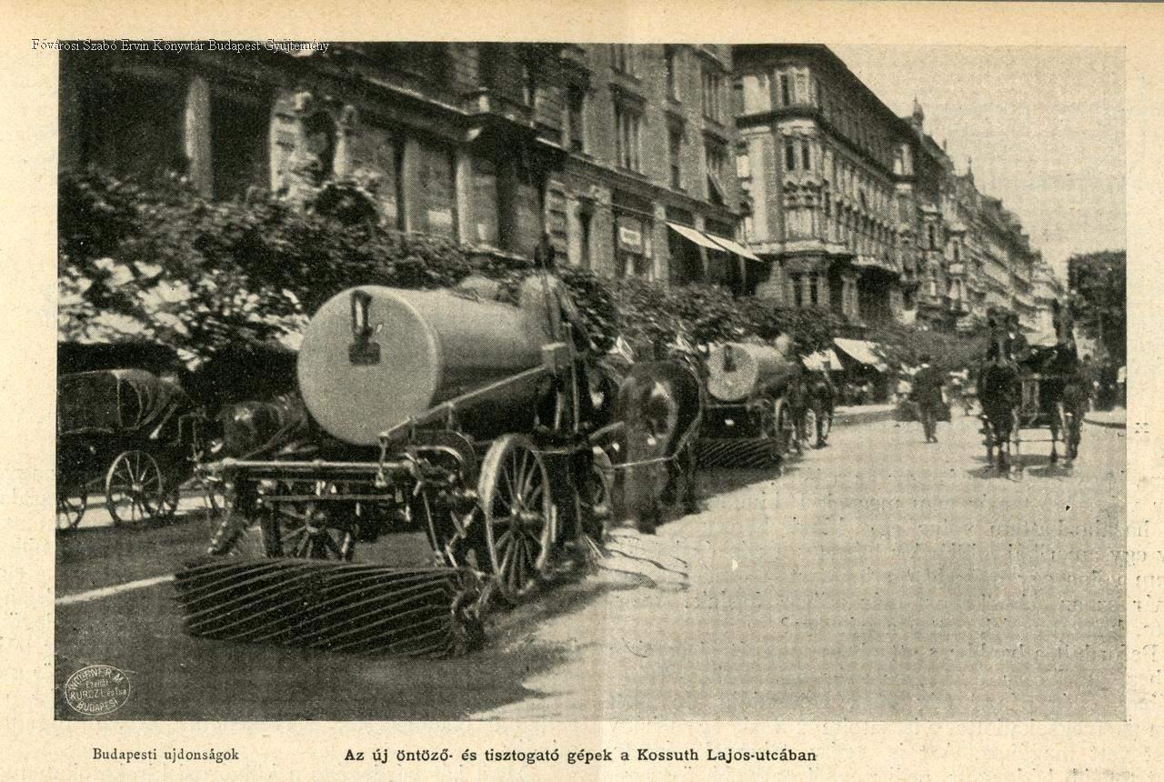 köztisztasági szolgáltatás, locsolókocsi, utcaseprés, lovas kocsi, 1909