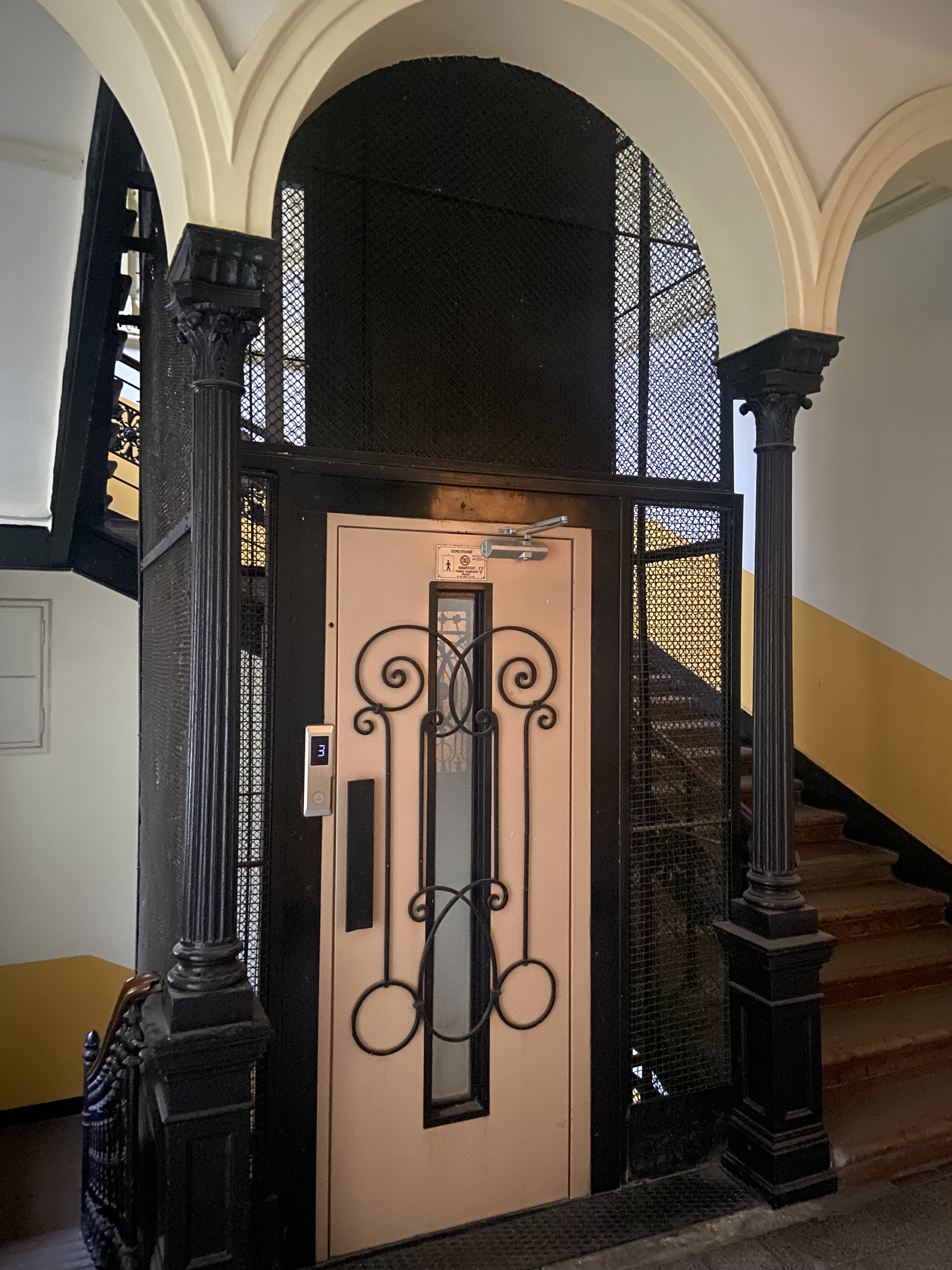 A főlépcsőházban kovácsoltvas, virágmintás korlát, tömörfa kapaszkodó fut körbe. A korlátok végén, emeletenként a liftakna két oldalán, öntöttvas oszlopokra, boltíves belépőt építettek. A lépcsőfordulók végén, a liftakna két oldalán a boltív ismétlődik.