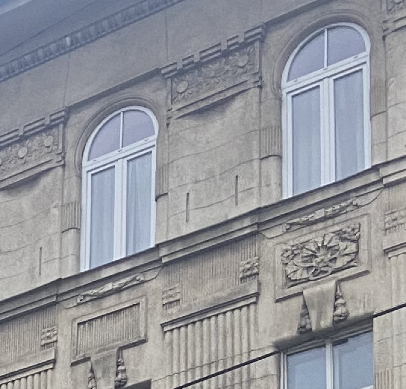 Az épület homlokzatát neoreneszánsz stílusjegyek jellemzik. A pilaszterek függőleges tagolása az ablakok melletti lapos oszlopokban jelenik meg. A hullámos szemöldökpárkány reliefjei olasz reneszánsz szemöldökdíszekre utalnak, ahogy a növényi ornamentika – stilizált virág/nap motívumok akantuszos levelekkel – plasztikus stukkóban erősíti a szimmetrikus, historizáló kompozíciót.