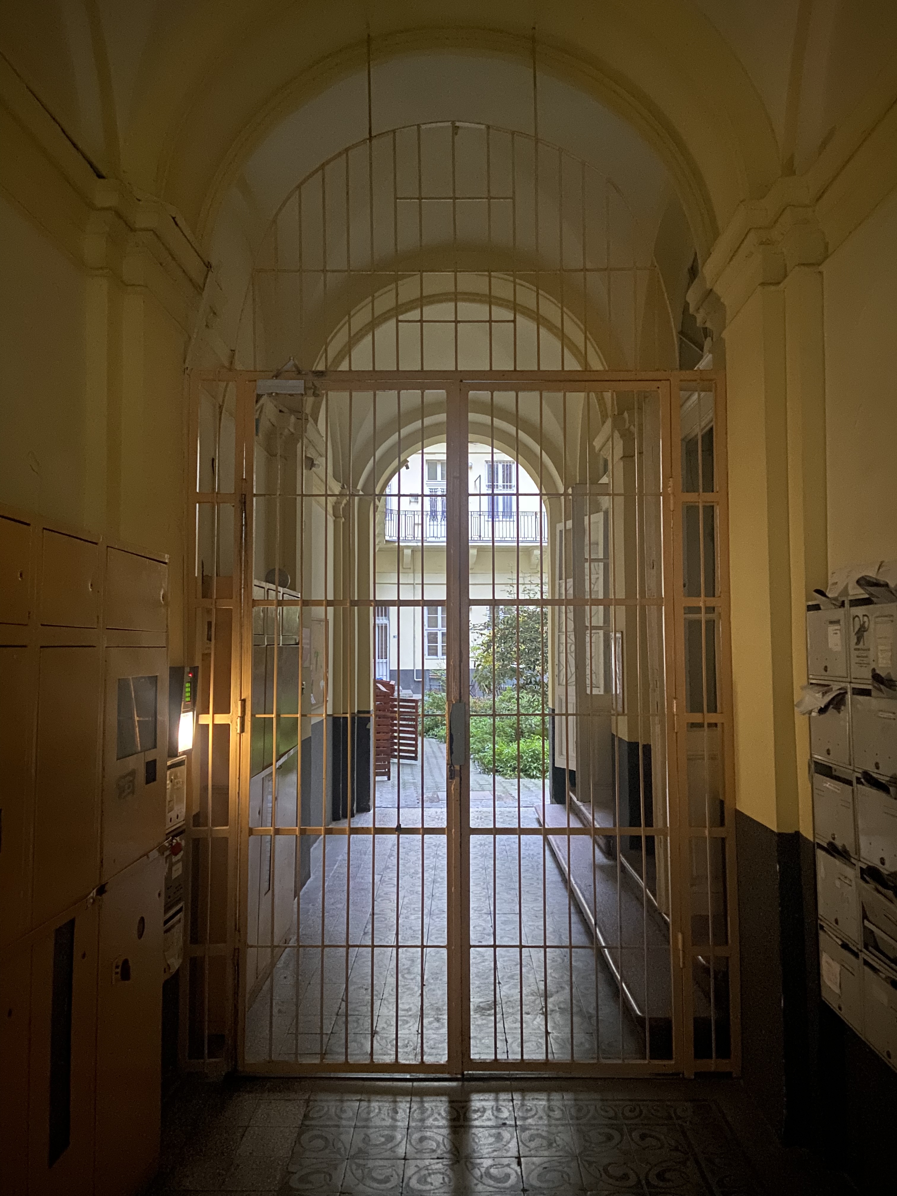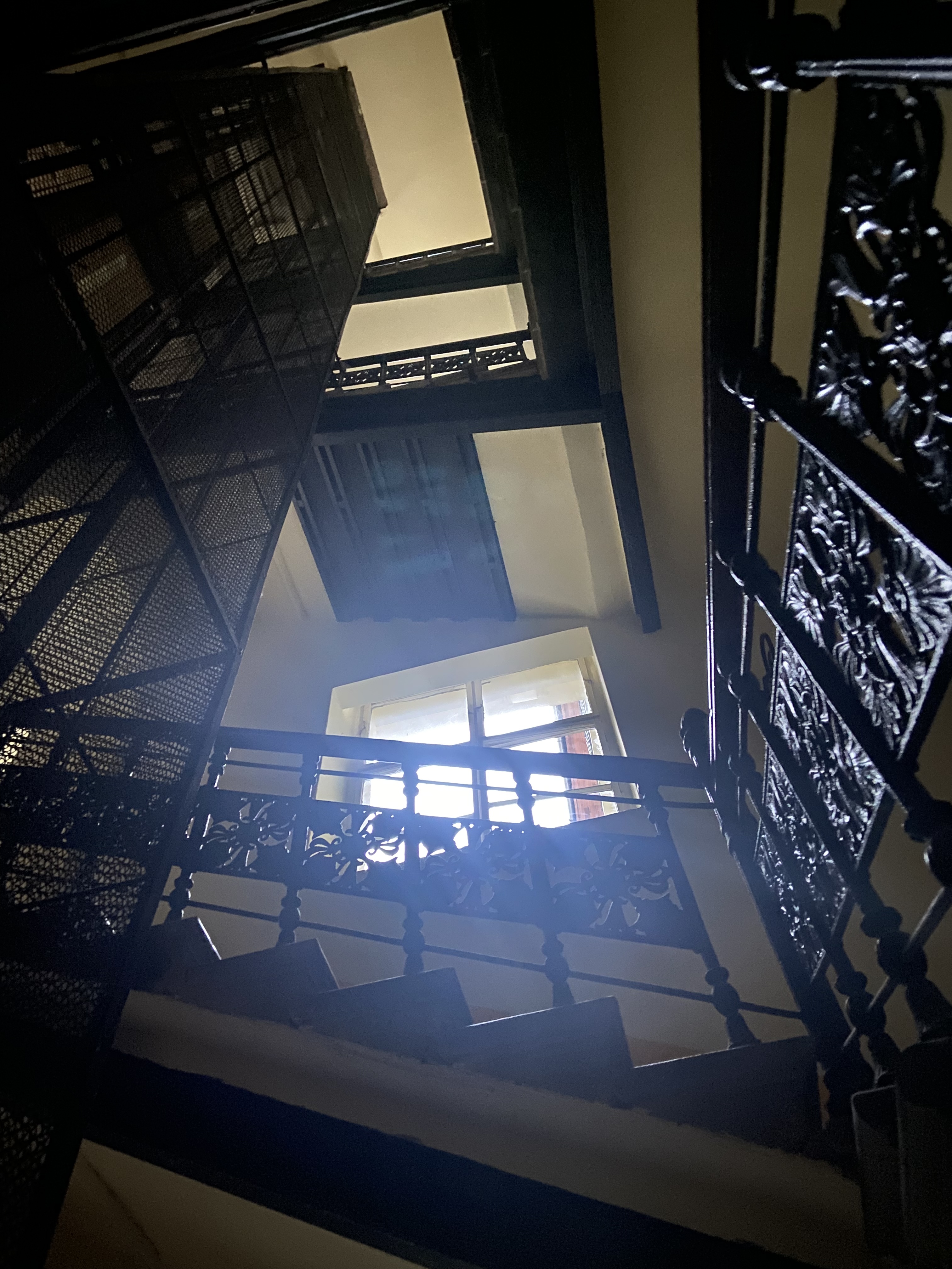 Az impozáns bérpalota díszes lépcsőházába és az abból nyíló függőfolyosókra csak a Király utca felől, ma már lifttel is, lehet eljutni. A zárt udvarból szűk „cselédlépcső” vezet a függőfolyosókra.