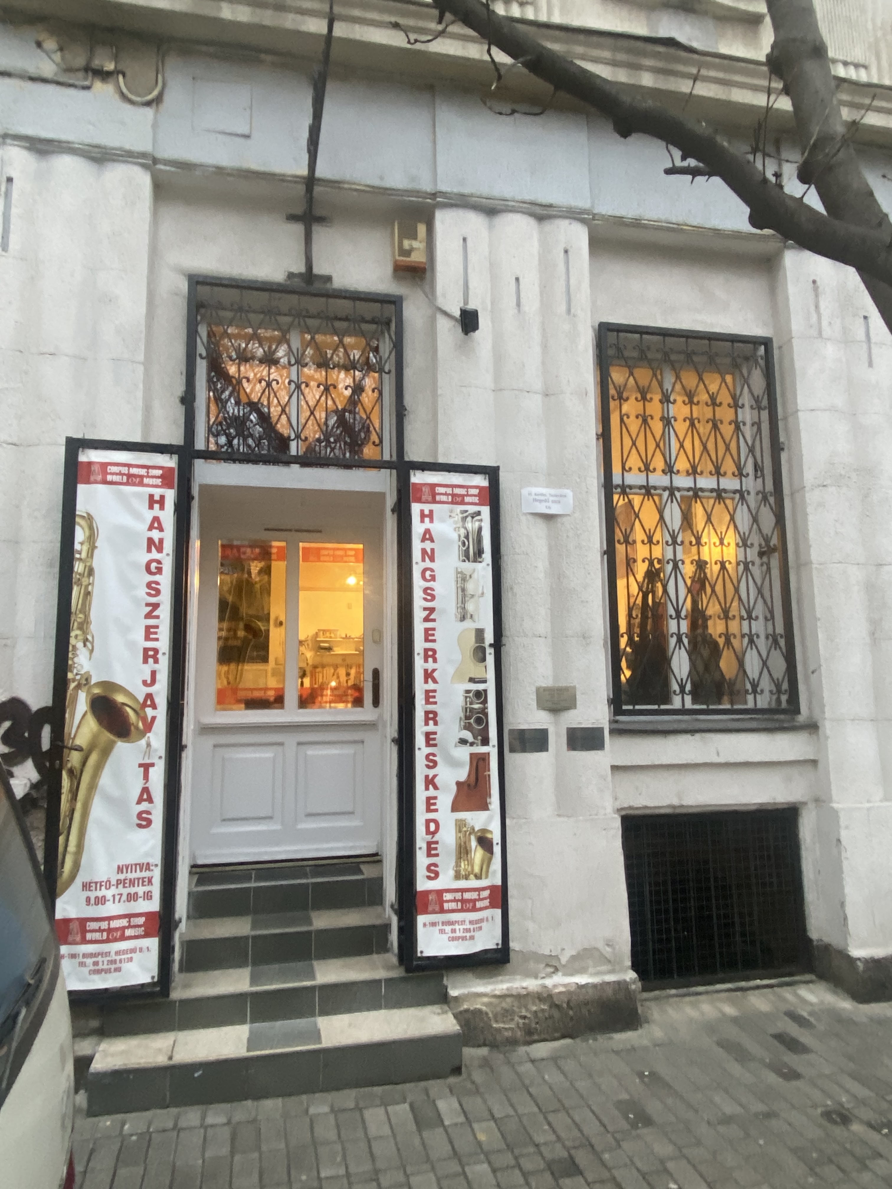 Szintén a Hegedű utca felőli oldalon, a földszinten, a kapun túli szakaszon a Corpus Hangszer Üzlet és Javítóműhely (Corpus Music Shop Egyéni Cég) egy ablakos üzletébe léphetünk néhány lépcső megtétele után. Mellette a Royal Palace thai masszázs szalonhoz hasonló utcai bejárat és három ablak tartozik. (Az előbbi 2012-ben, az utóbbi 2025 decemberében nyílt meg.)